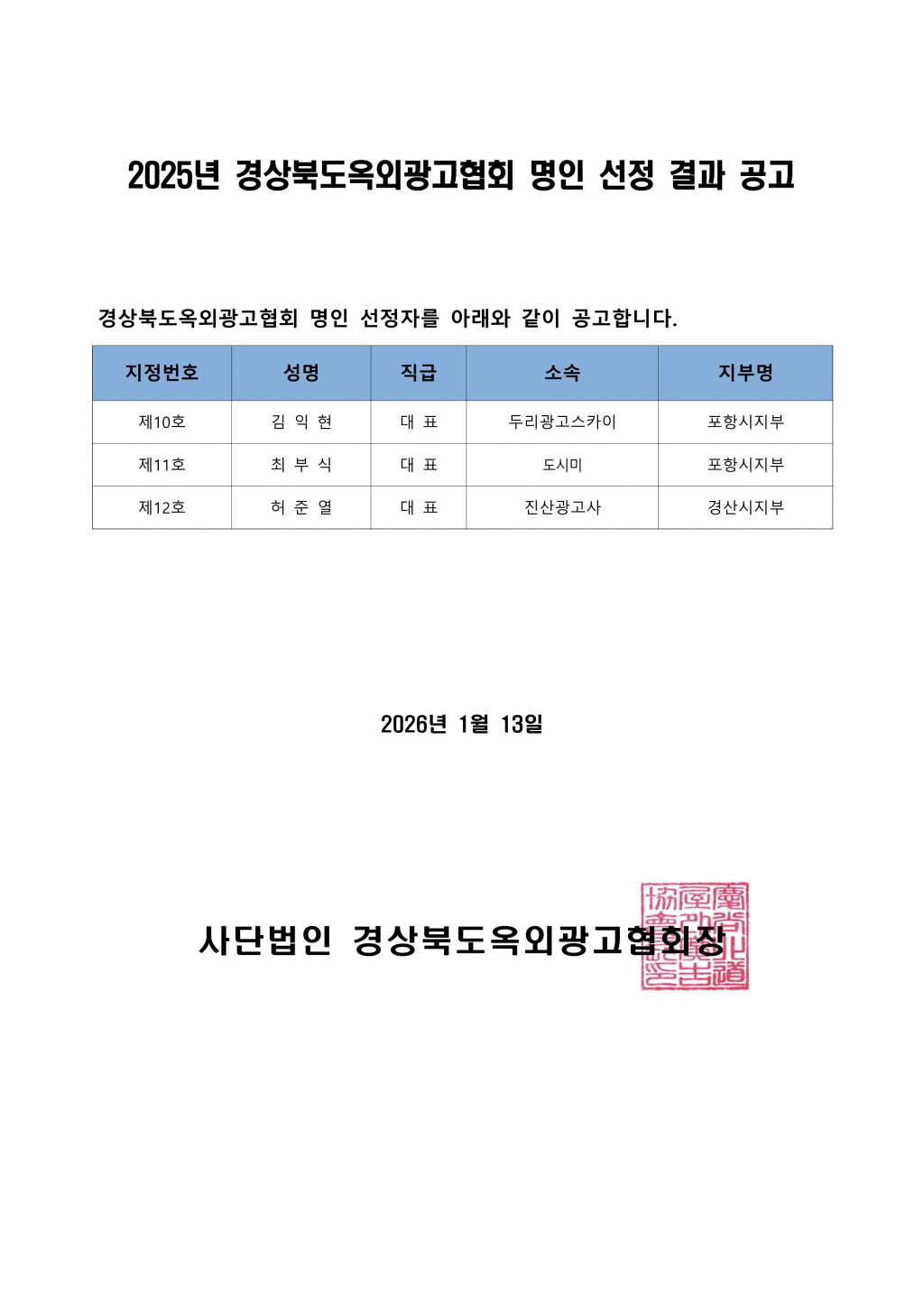 2025년 경상북도옥외광고협회 명인 선정결과 공고